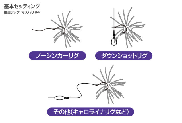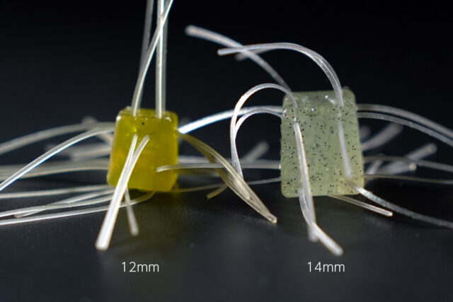 サイコロラバーはその見た目から虫やエビを捕食しているバスに威力を発揮するのは想像に難くないがベイトフィッシュをセレクティブに追うバスも射程圏内とする。では何故、一つのルアーで幅広くバスを反応させてしまうのだろうか?それは小さなシルエットながら大きな水押しを発生させ瞬間的に移動するサイトのテクニック「逃がし」を高次元で成立するからに他ならない。使い方はノーシンカー(マスバリ#4)でバスの目線までフォールさせバスがチェイスしてきたらトゥイッチでバスから逃がすことにより本気食いさせることができる唯一無二のワームである。サイコロラバーNONSALTは峯村がメインで使用していた本家サイコロラバーVol.3(12mm)をO.S.Pが量産化したモデルになる。小さすぎず大きすぎないサイズ感は様々なリグに対応しノーシンカーでの使用の際もスピニングロッドUL~Lクラス、フロロカーボンライン3~4lbでの使用でも簡単にキャスト、操作することができる。また本家サイコロラバーよりあえて固めの素材に設定することにより針持ちを向上させ、誰でも扱いやすい仕様となっている。