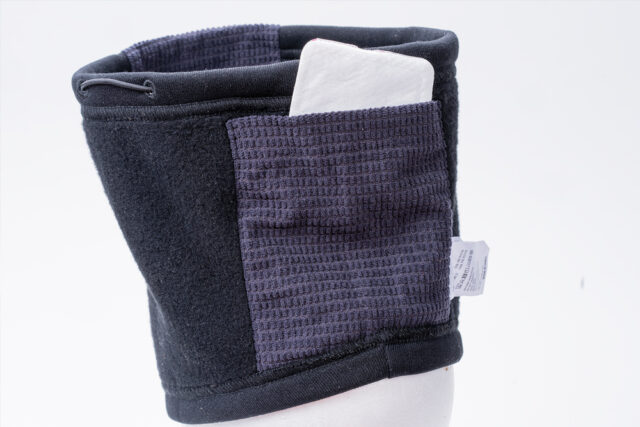 首裏部分には使い捨てカイロを入れられるポケットを装備