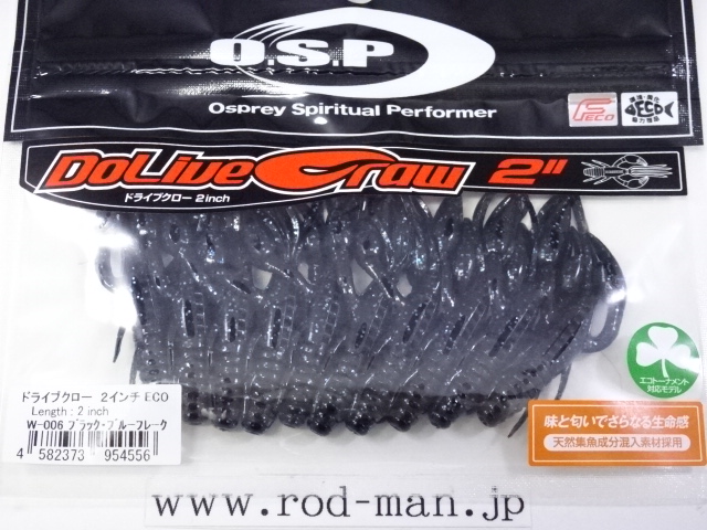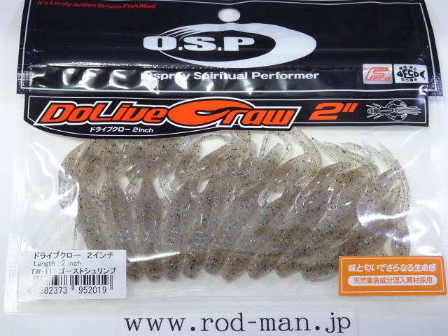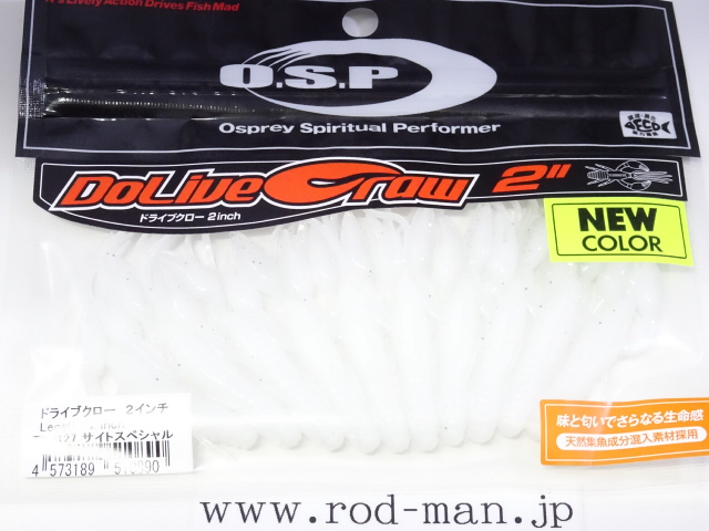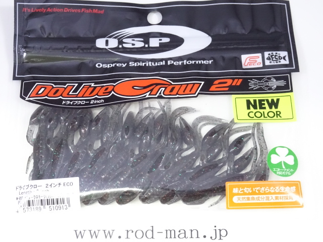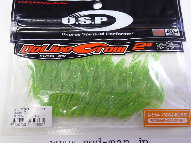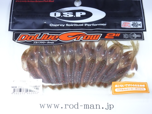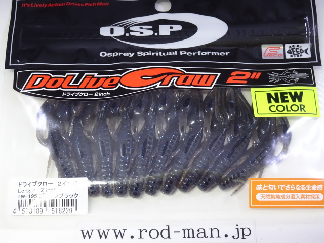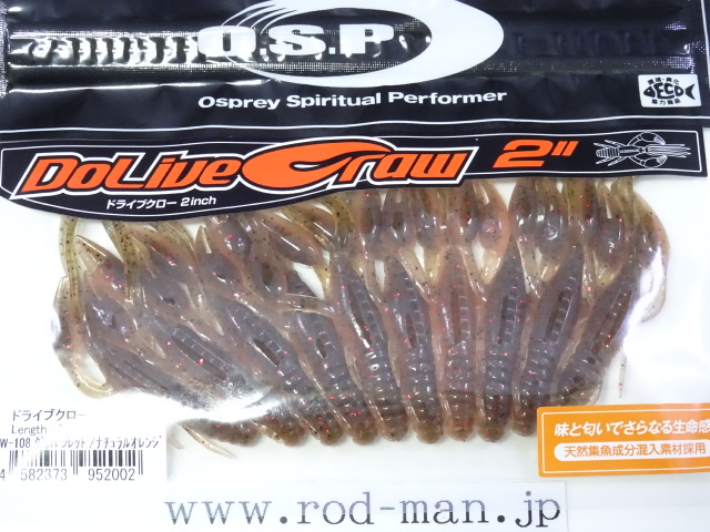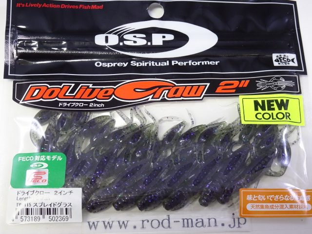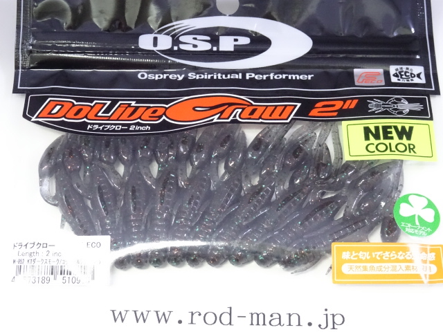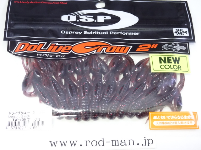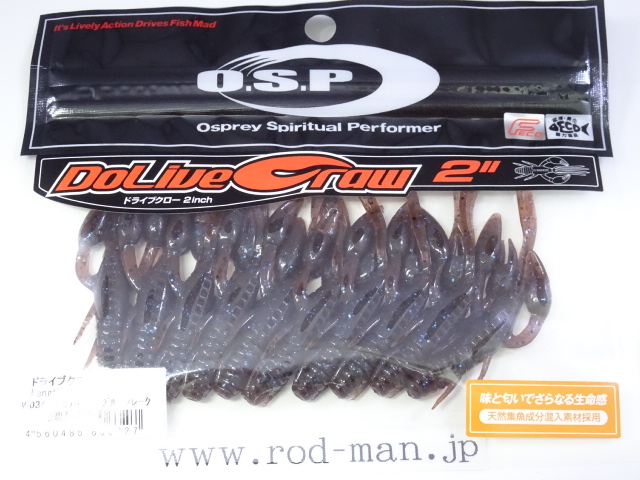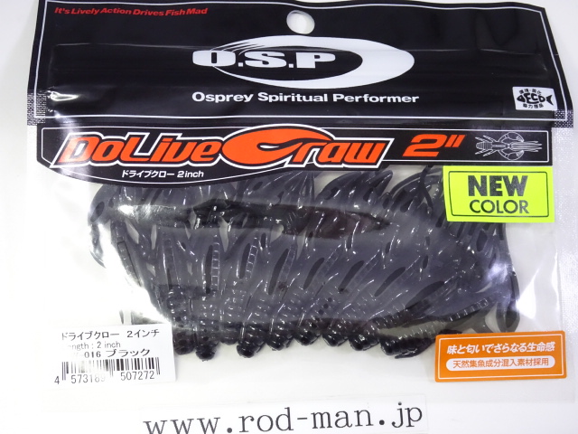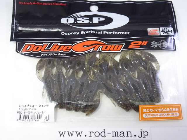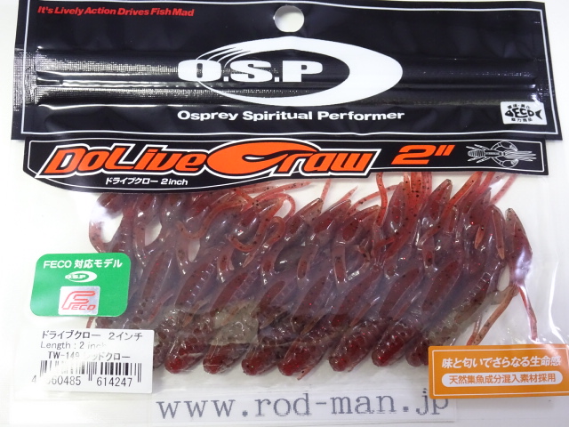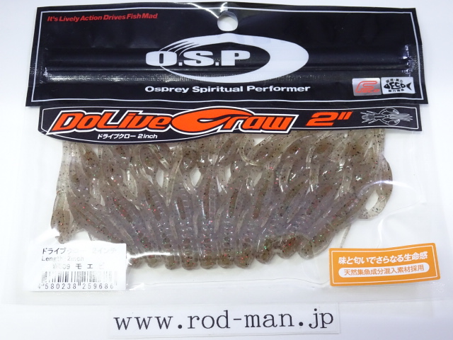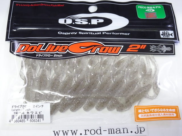 究極のクローベイトを創るための開発は、これまでのクロー系、ホッグ系ワームのアクションを徹底検証するところからスタートした。スーパークリアなプールでのアクションテストと実釣を繰り返した結果、バイトはそのワームが「生命感ある動きを見せた」ときに集中。フォールで艶かしく動くものはフォール中に、その後の誘いで本領を発揮するものはその誘い中に、といった具合に・・・。逆にいえば、着水からピックアップまでの一連の動作の中でワームが魅力を失う隙が生じてしまえば、そこでバイトチャンスをロスすることを意味する。O.S.P初のワーム、『ドライブクロー』は、゛全てのパーツが無駄なく機能し、何時如何なる時でもバスを誘い続ける゛各パーツのそれぞれ異なった動きがMIXすることで生まれる別格の艶かしさはフォール中のバイトを激増させる。着底直後にはボディーに対してハサミとヒゲが遅れてスローに倒れ込む時間差アクションが発生してバスを魅了し、その後の様々なパターンの誘いでもパーツのどこかが常にバスを誘い生命感を失うことはない。まるで生きているかのような蠢き(うごめき)と疑いなき強烈なバイトを体感してほしい。