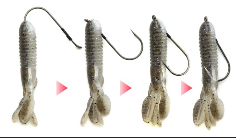 アイがワームの中心線に近くなることにより、ワームの回転を極限まで減らします。また、テキサスリグやリーダーレスダウンショットでセットした際のリグの収まりもスマートに。