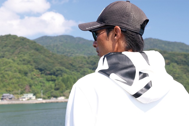 フード部分に大きくあしらったロゴが目を引くデザインで、フーディ全体の形状や、なめらかで肌触りの良い生地などを選定するなどこだわりの仕様です。
