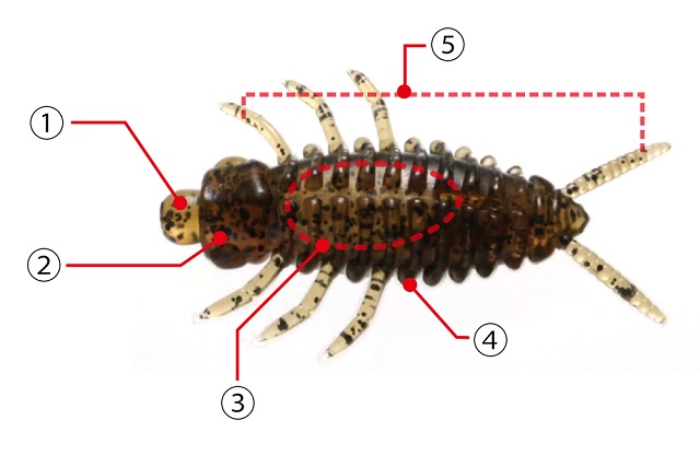 - ⑤3対の脚と1対の触覚型テールは、素材の柔らかさと相まって、水流によりユラユラと艶かしく動きます。