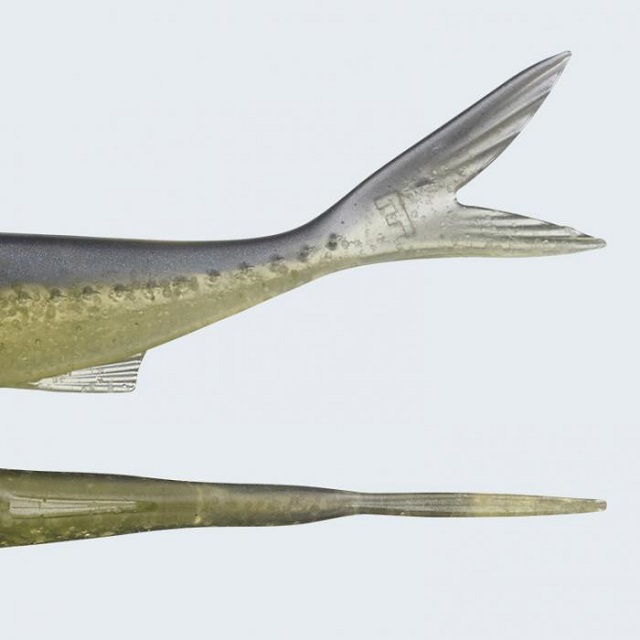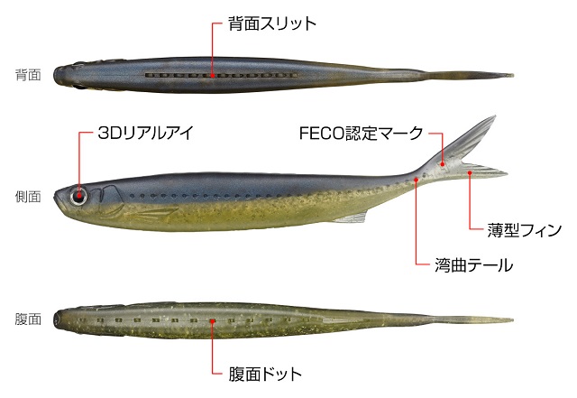 反り上がったテール(湾曲テール)の絶大な効果で、2つの異なる系統の動きが同時に発生。それが、ボディサイドのフラット面で水を強く押す「パワーロールアクション」と、尾ビレ(薄型フィン)をしなやかにくねらせ水を掻く「ナチュラルスイング」の組み合わせ。