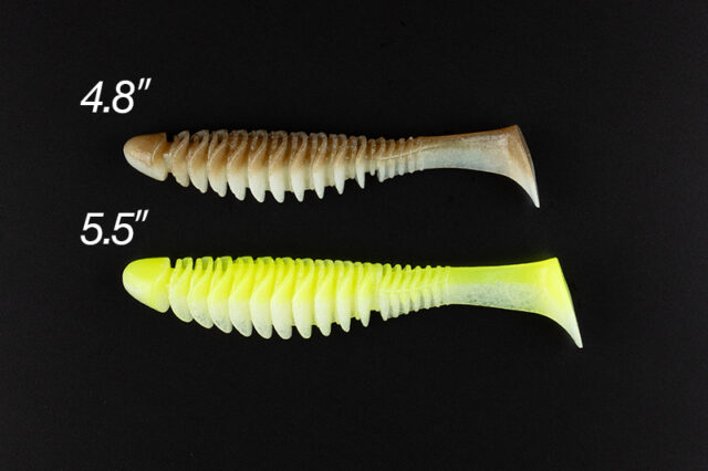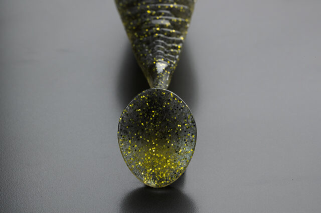 高比重マテリアル採用で自重【4.8”/約18g 5.5″/約25g】があり、一枚下のレンジをデッドスローで攻略可能です。ネイルシンカーを用いるとスイム姿勢を安定させる事が非常に難しいことから誕生したモデルです。
