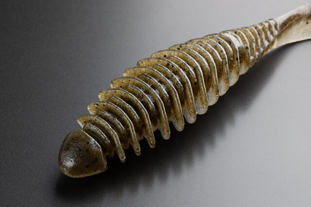 ボディ全体に設けられた大きく深いマルチリブが水流をしっかり受けることで。デッドスローでも正確なピッチを刻んだアクションを可能にします。水の抵抗を受け、細かくバイブレーションするのも特徴です。