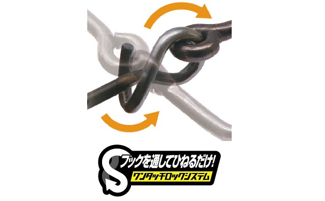 フックを通してひねるだけ!ワンタッチでフックを交換でき、実釣では抜けにくいクロス機構。フックの横倒れを抑え、針先が常に上を向くことでフッキング性能にも優れます。