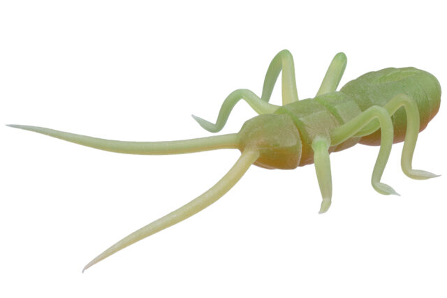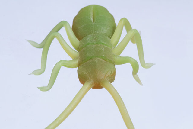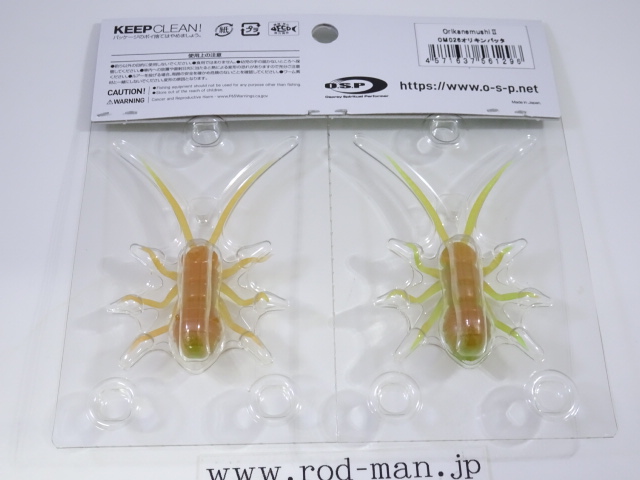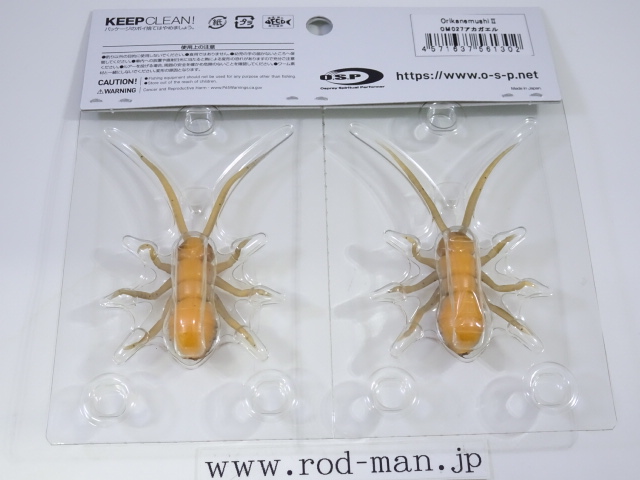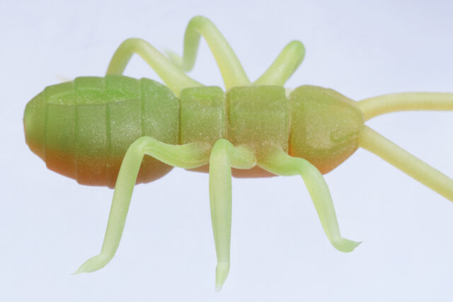 折金一樹が新オリカネムシに求めたのは、特定の虫にならない事。あらゆる種類の虫に見え、時には蛙や甲殻類にも見えるシルエットにすることが条件となった。さらに折金は飛距離も追求。ベースボディを後方重心にすることで抜群のキャストアキュラシーを実現。これにより吊るし時も枝葉を貫通させやすくなった。ボディ素材にはエラストマーを採用。枝などに引っ掛かっても壊れにくく、ボディに対して大きな触角と側面の3対の立体的な脚はライブリーな水押しとピリピリ感を演出。エラストマー素材の特性を活かした形状となっている。またボディ後方のクビレ部分を細くすることにより、前後で独立したアクションと振動を発生。バイト時に折りたたまれやすく、針先が出ることでフッキングが向上するメリットもある。