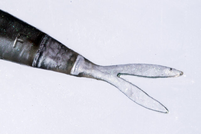 テールの付け根にあるスリットは緻密に設計された間隔で、テール同様、製造上の限界値となる極薄で設計。ロッドアクションをせずとも、微妙なラインスラッグの揺れや水の動きも捉えナチュラルなアクションを演出。人為的な操作をせずとも、自発的に繊細に誘い続ける。