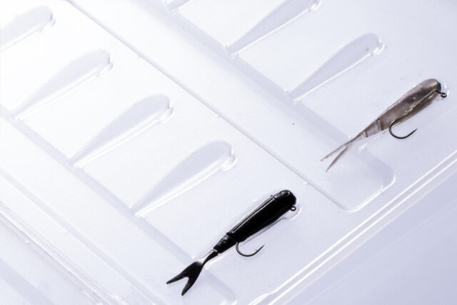 縦横どちらのセッティングでも対応可能な専用ブリスターにパッケージング。フックをセットしたまま保管が可能なため、自宅などでセッティングしたまま保管が可能。よりシビアなセッティングが求められるマイクロベイトにおいて大きなアドバンテージとなる。
