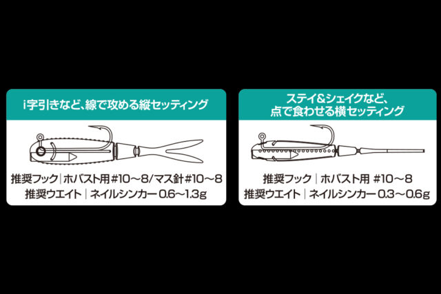 通常のセッティング(縦刺し)では、i字系ルアーとして安定したスイム姿勢を維持し、バスが追尾してきた際に、逃しアクションで小刻みにアクションしバイトに持ち込む。
