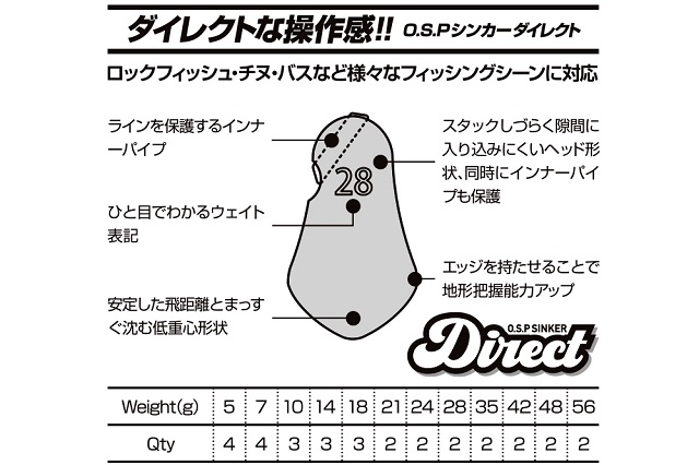 O.S.Pシンカーダイレクトは、魚種を問わず幅広いフィッシングシーンで必要とされる、ボトムゲームに必要な性能を徹底追及しデザインされたシンカーである。求められる性能は、良く飛び、早く真っ直ぐ沈み、障害物を躱しつつボトム感知能力が高いこと。これらを満たすべく、数十種類に及ぶテストサンプルをフィールドで検証。たどり着いたのは、低重心かつ本体頂上部には丸みを持たせた形状であった。この形状は岩や消波ブロックの隙間などへのスタックを回避し、更に本体頂上部が障害物に当たり難くなりラインを通すインナーパイプへのダメージを軽減。インナーパイプの内径は使用するラインの太さも考慮した設計で、例えばフリーリグではワームとシンカーが、より離れ易くなりナチュラルな誘いを可能にしている。ウェストエッジと名付けられた形状は、ボトムの起伏や石などに対し、スルスルと抜けすぎず、それでいながら地形情報を明確にアングラーに伝えてくれる役割を果たし、結果的に根がかり回避にも大きく貢献。実釣で求められる性能を高次元で纏ったO.S.Pダイレクトシンカーは「たかがシンカー」という概念を覆す。