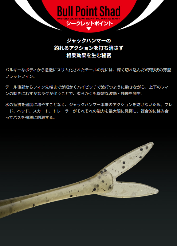 ブルポイントシャッド。数多くのトーナメントでウイニングルアーに輝き続けるジャックハンマーが、さらに釣れるルアーへと進化する。