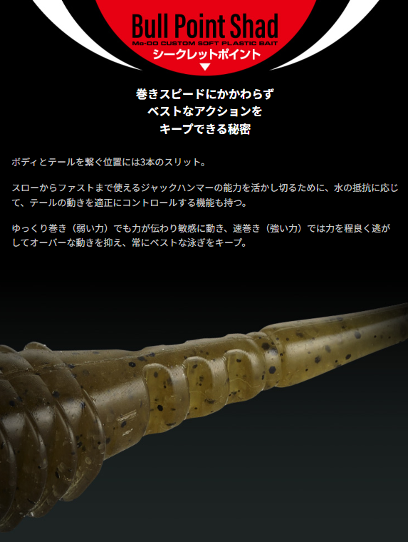 また、フックにセットする際、スリムなワームは、少しズレただけで左右の重量バランスが崩れてしまうが、太めのヘッドはズレに対する許容度が比較的大きく、セット位置によるバラツキが発生しにくいのも実戦向き。