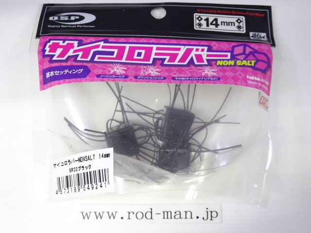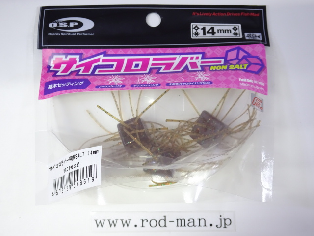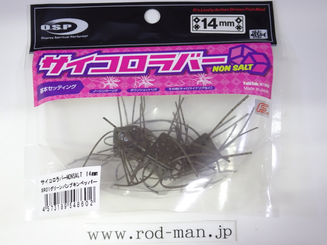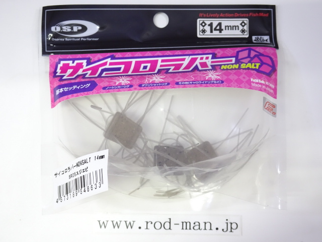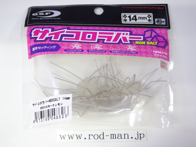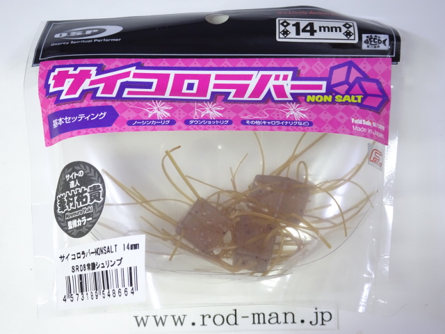 サイコロラバーはその見た目から虫やエビを捕食しているバスに威力を発揮するのは想像に難くないがベイトフィッシュをセレクティブに追うバスも射程圏内とする。では何故、一つのルアーで幅広くバスを反応させてしまうのだろうか?それは小さなシルエットながら大きな水押しを発生させ瞬間的に移動するサイトのテクニック「逃がし」を高次元で成立するからに他ならない。使い方はノーシンカー(マスバリ#4)でバスの目線までフォールさせバスがチェイスしてきたらトゥイッチでバスから逃がすことにより本気食いさせることができる唯一無二のワームである。サイコロラバーNONSALTは峯村がメインで使用していた本家サイコロラバーVol.3(12mm)をO.S.Pが量産化したモデルになる。小さすぎず大きすぎないサイズ感は様々なリグに対応しノーシンカーでの使用の際もスピニングロッドUL~Lクラス、フロロカーボンライン3~4lbでの使用でも簡単にキャスト、操作することができる。また本家サイコロラバーよりあえて固めの素材に設定することにより針持ちを向上させ、誰でも扱いやすい仕様となっている。