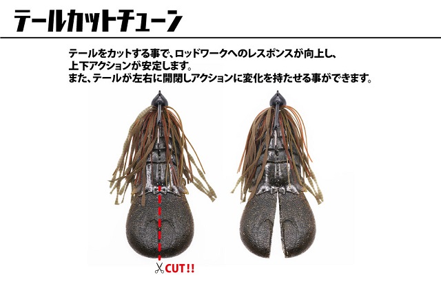 ファットなテールがワームとは思えない程の強烈な振動を生み、まるで生き物がダッシュで逃走する様な 波動とアクションでデカバスの本能を刺激しバイトを誘います。 またスキッピングしやすく、カバーの奥に滑り込ませて”ブルッ”と外まで出してくるメソッドは、カバーを撃つ だけでは喰わないバスをも反応させます。