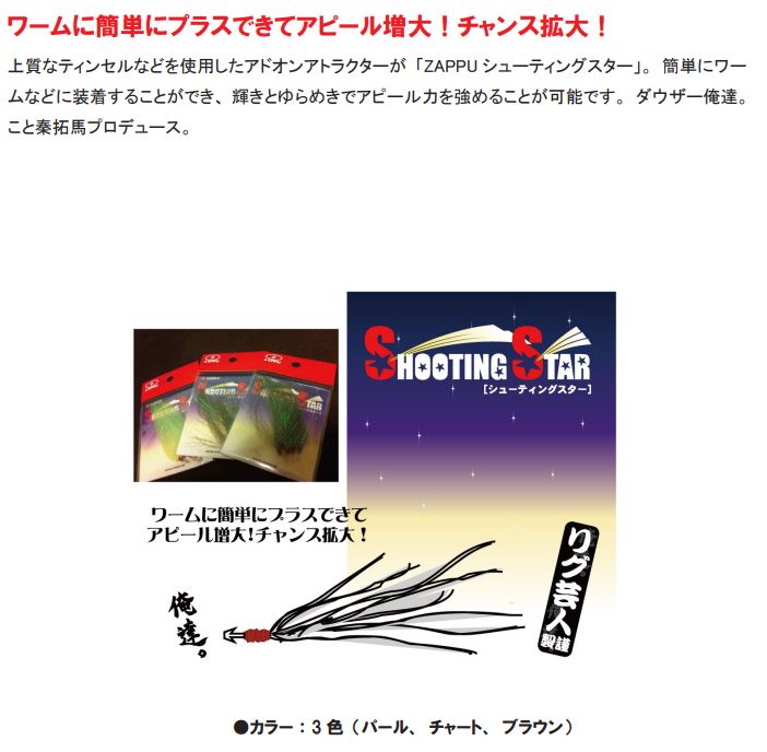 ザップ シューティングスター 商品番号:2000002426 ザップ シューティングスター #パール ¥500 ¥500(税別) ( 税込¥550 ) 数量点 #ブラウン ¥500 ¥500(税別) ( 税込¥550 ) 数量点 #チャート ¥500 ¥500(税別) ( 税込¥550 ) 数量点 ◆カラーチャート #パール #ブラウン #チャート ワームに簡単にプラスできてアピール増大!チャンス拡大! 上質なティンセルなどを使用したアドオンアトラクターが 「ZAPPUシューティングスター」。簡単にワームなどに装着する ことができ、輝きとゆらめきでアピール力を強めることが可能です。