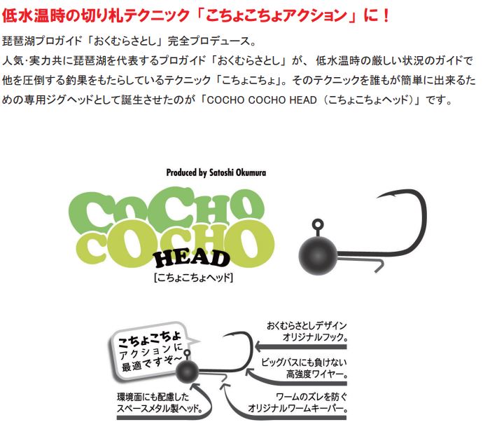 琵琶湖プロガイド「おくむらさとし」完全プロデュース。人気・実力共に琵琶湖を代表するプロガイド「おくむらさとし」が、低水温時の厳しい状況のガイドで他を圧倒する釣果をもたらしているテクニック「こちょこちょ」。 そのテクニックを誰もが簡単に出来るための専用ジグヘッドとして誕生させたのが「COCHO COCHO HEAD(こちょこちょヘッド)」です。