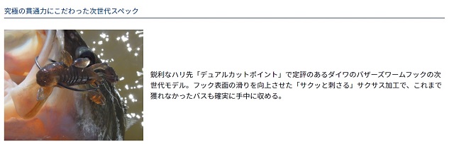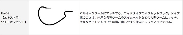 ダイワ バザーズ ワームフックSS エキストラワイドオフセット(EWOS) 商品番号:2000004232 ダイワ バザーズ ワームフックSS エキストラワイドオフセット(EWOS) #2 ¥450 ¥450(税別) ( 税込¥495 ) 数量点 #2/0 ¥450 ¥450(税別) ( 税込¥495 ) 数量点 ◆サイズ #2 #2/0 EWOS【エキストラワイドオフセット】: バルキーなワームでもきちんとフックセット出来るワイドタイプのオフセットフックです。ゲイプ幅の広さは、肉厚な各種ワームやスイムベイトなどの大型ワームに適し微かなバイトでもハリ先は飛び出しやすく確実にフックアップすることが出来ます。