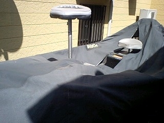 朝起きて玄関を出てみると、レンタルボートのボートカバーが暴風で破れてた事。