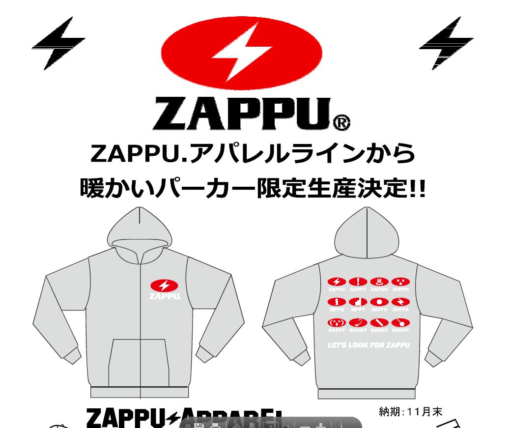 前にザップマーク、背中に商品ロゴがあしらわれたZAPPU初のパーカー新登場です!