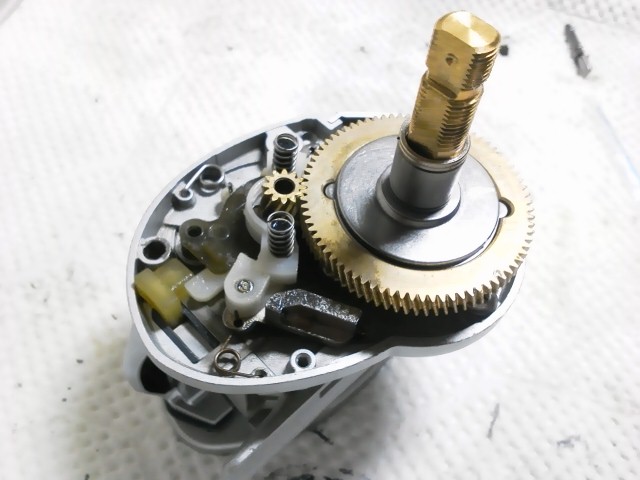続きまして、カルカッタコンクエスト101のオーバーホールをさせていただきました。回転時にゴリ感があるとのことでギア交換・ベアリング交換をさせていただいたのですが、それでも問題が解決せず、最終的にはスプールの軸が曲がっていることが判明。お客様と相談させていただき、ギア周りと摩耗していた内部ベアリング交換をさせていただきました。